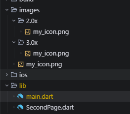 例如,要向我们的 Flutter 项目中添加一个名为 my_icon.png 的新图像资源,并决定将其放在一个我们随意命名为 images 的文件夹中,你需要将基础图像(1.0 倍)放在 images 文件夹里,而所有其他变体则放在以相应比例乘数命名的子文件夹中: