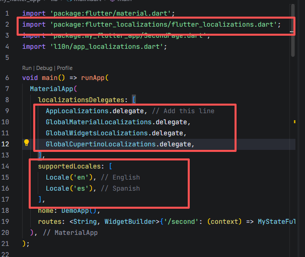 然后导入 flutter_localizations 库,并为你的 MaterialApp 或 CupertinoApp 指定 localizationsDelegates 和 supportedLocales: