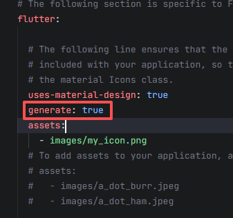 打开 pubspec.yaml 文件并启用 generate 标志。该标志位于 pubspec 文件的 flutter 部分。