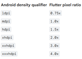Flutter 采用一种类似 iOS 的简单基于密度的格式。资源可能是 1.0 倍、2.0 倍、3.0 倍或其他任何倍数。Flutter 没有设备独立像素(dps),但有逻辑像素,其本质上与设备独立像素相同。Flutter 的** devicePixelRatio 表示单个逻辑像素中物理像素的比例**。
