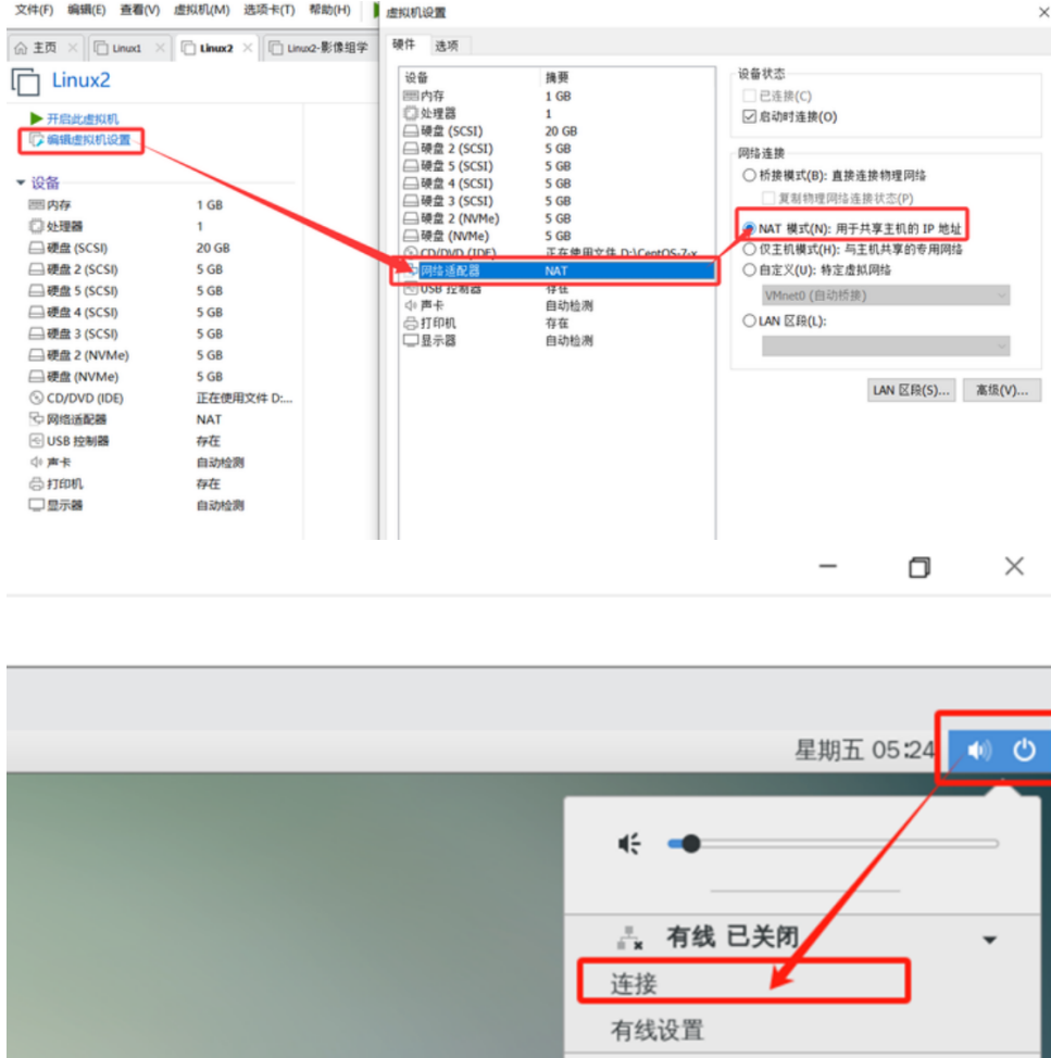 - 设置虚拟机网络适配器为NAT模式,然后开启虚拟机,打开"有线连接"