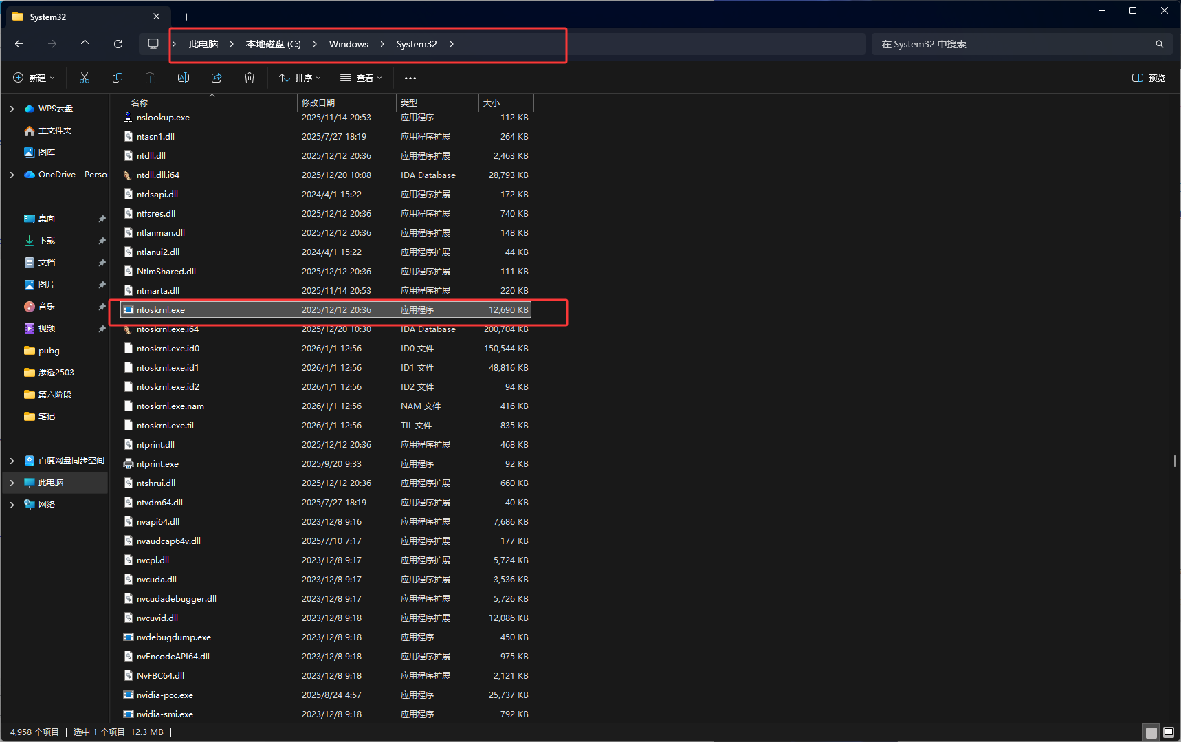 句柄表算法函数是叫ExpLookupHandleTableEntry,它是一个未导出函数,它所在的位置比较底层,然后它在ntoskrnl.exe中,ntoskrnl.exe所在的目录如下图红框