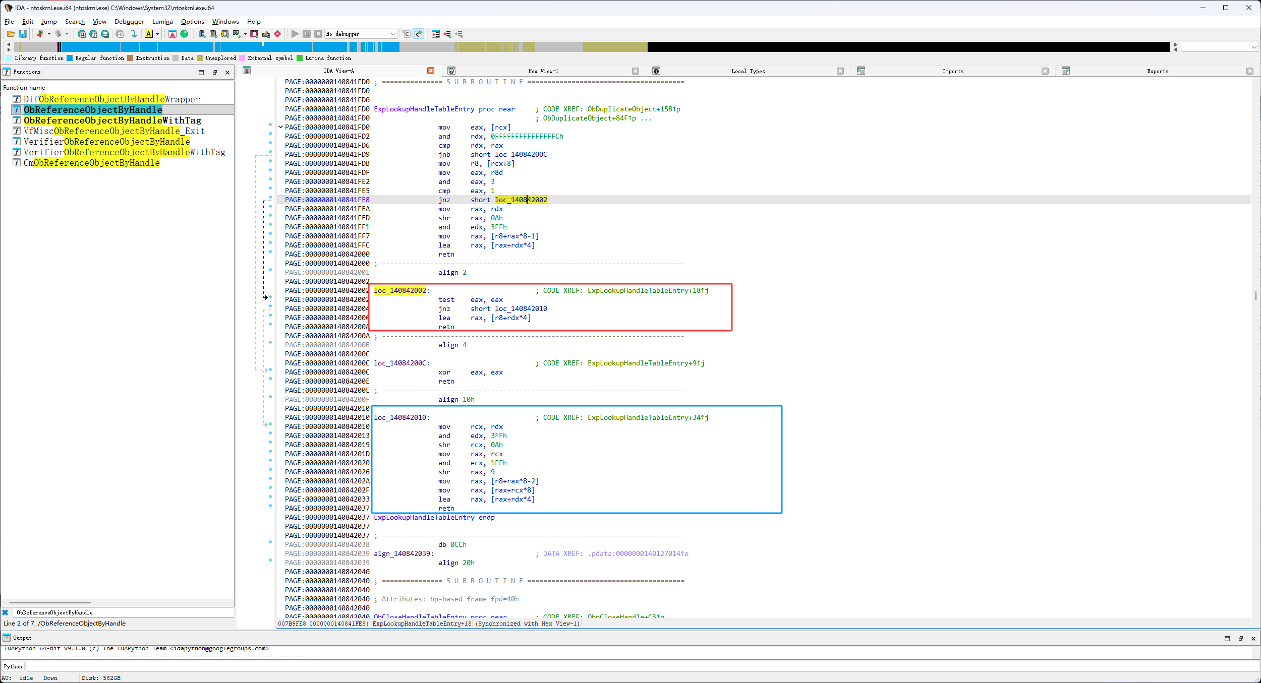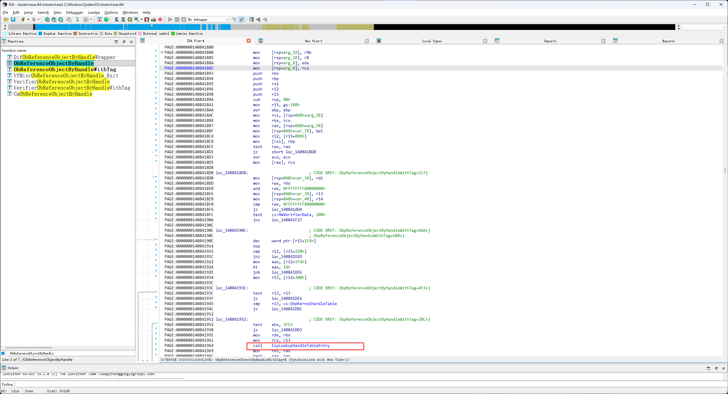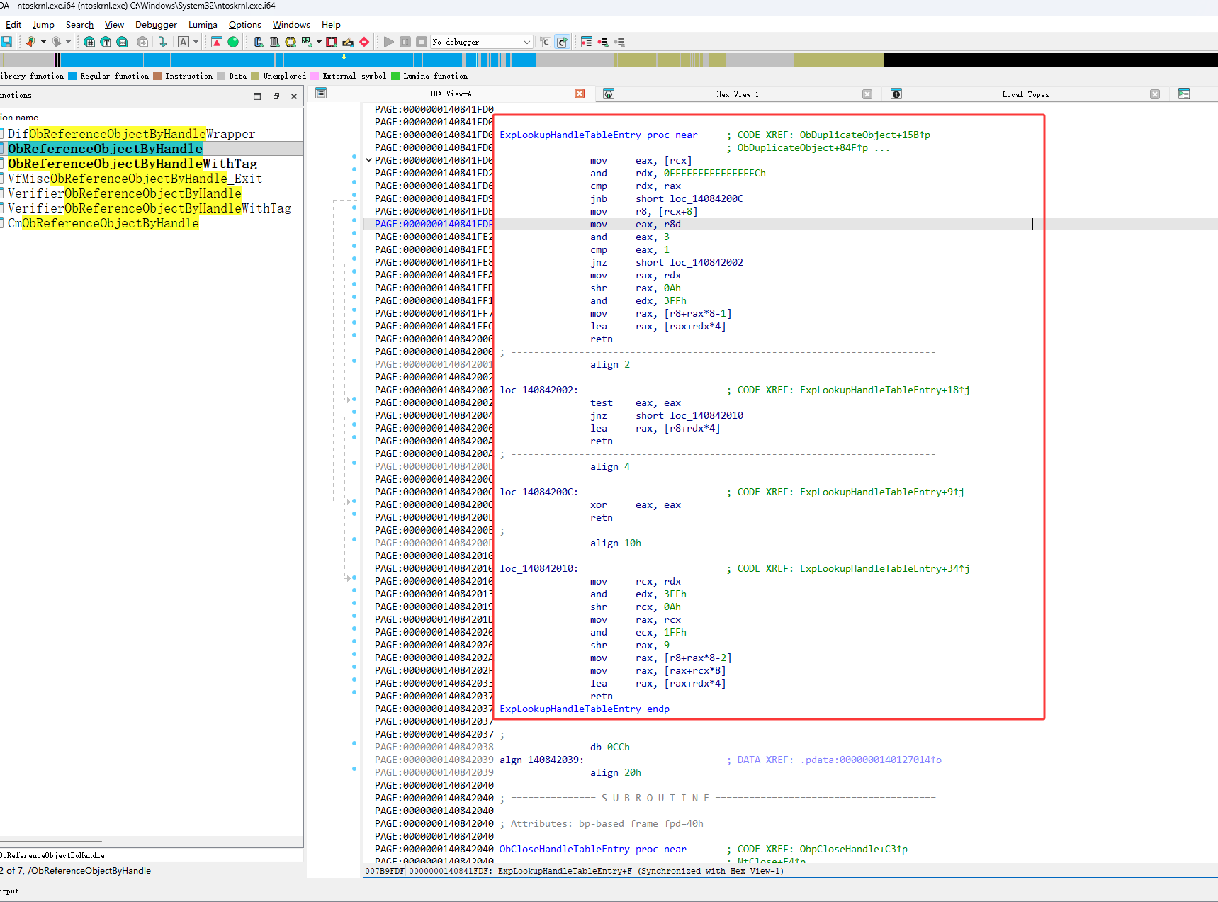 然后进入它call的ObpReferenceObjectByHandleWithTag函数,如下图红框就可以看到我们要找的ExpLookupHandleTableEntry函数了