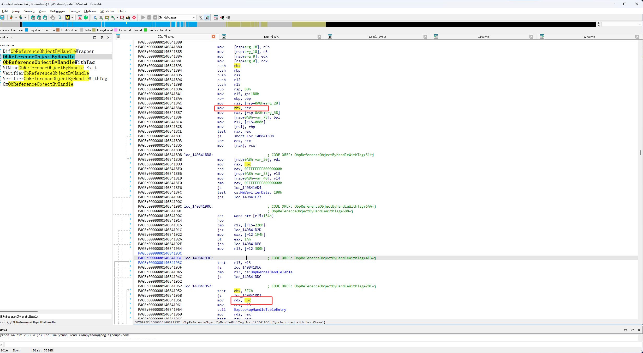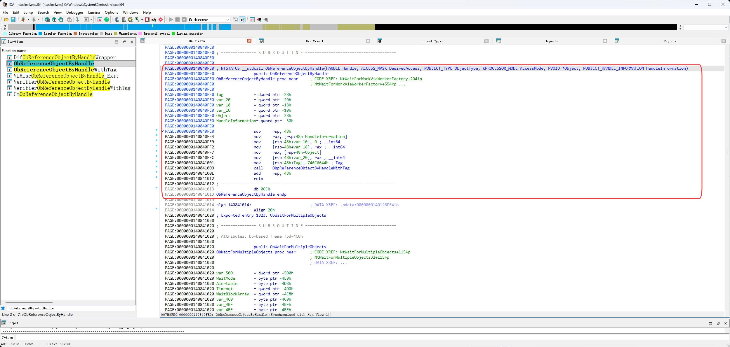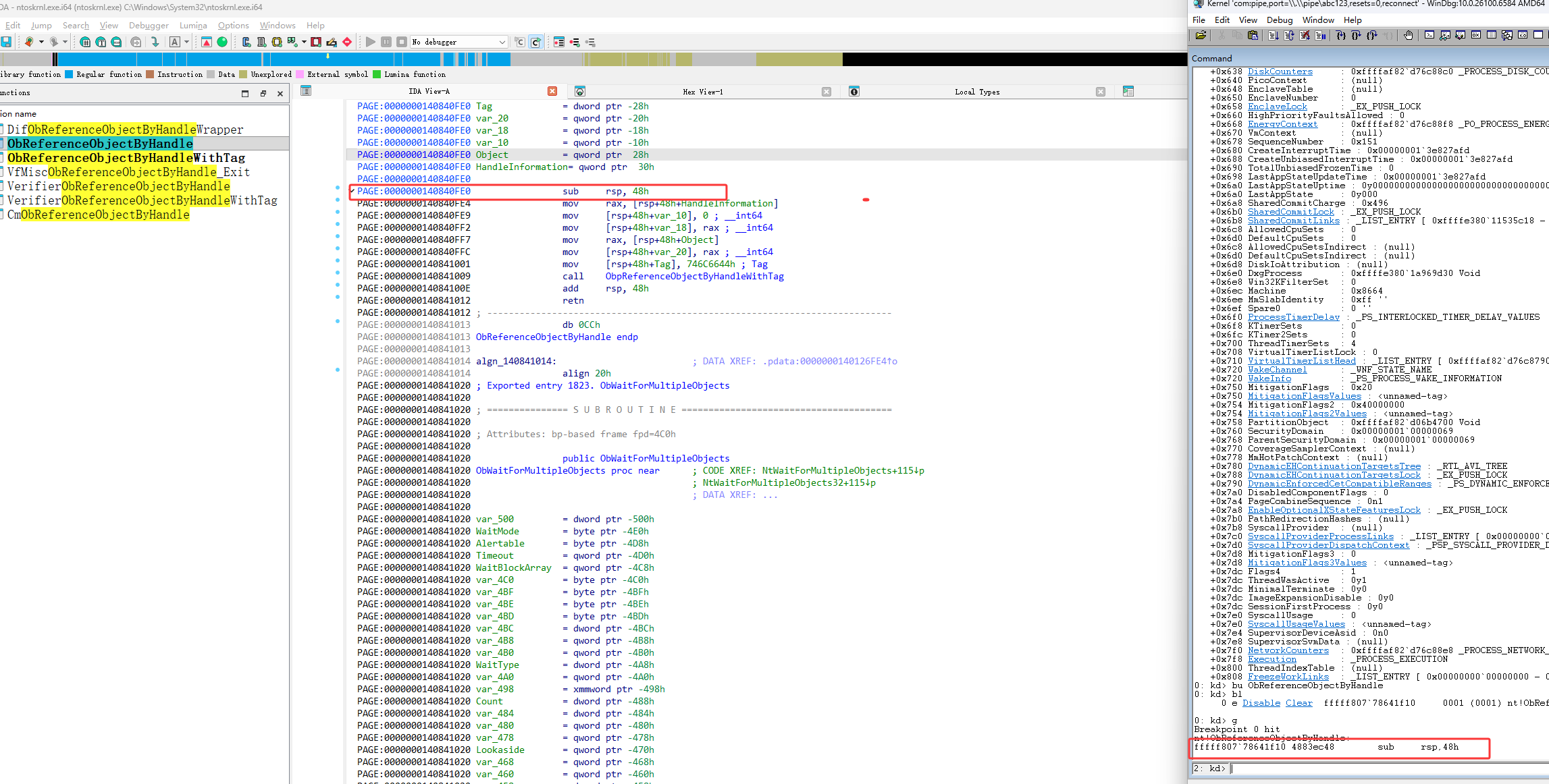 然后进入它call的ObpReferenceObjectByHandleWithTag函数,如下图红框就可以看到我们要找的ExpLookupHandleTableEntry函数了