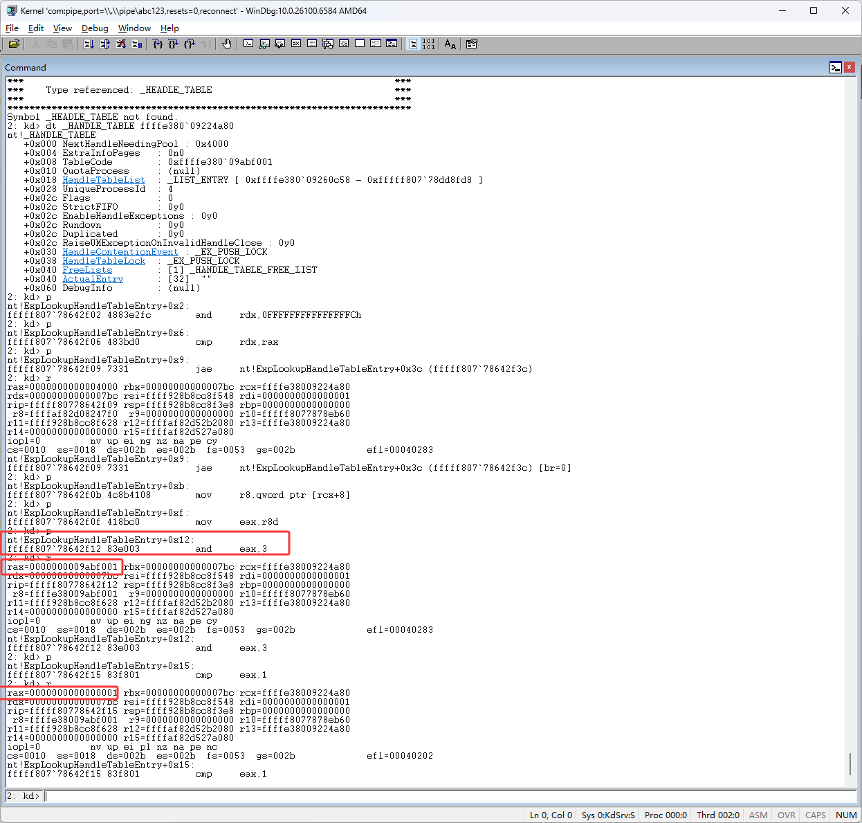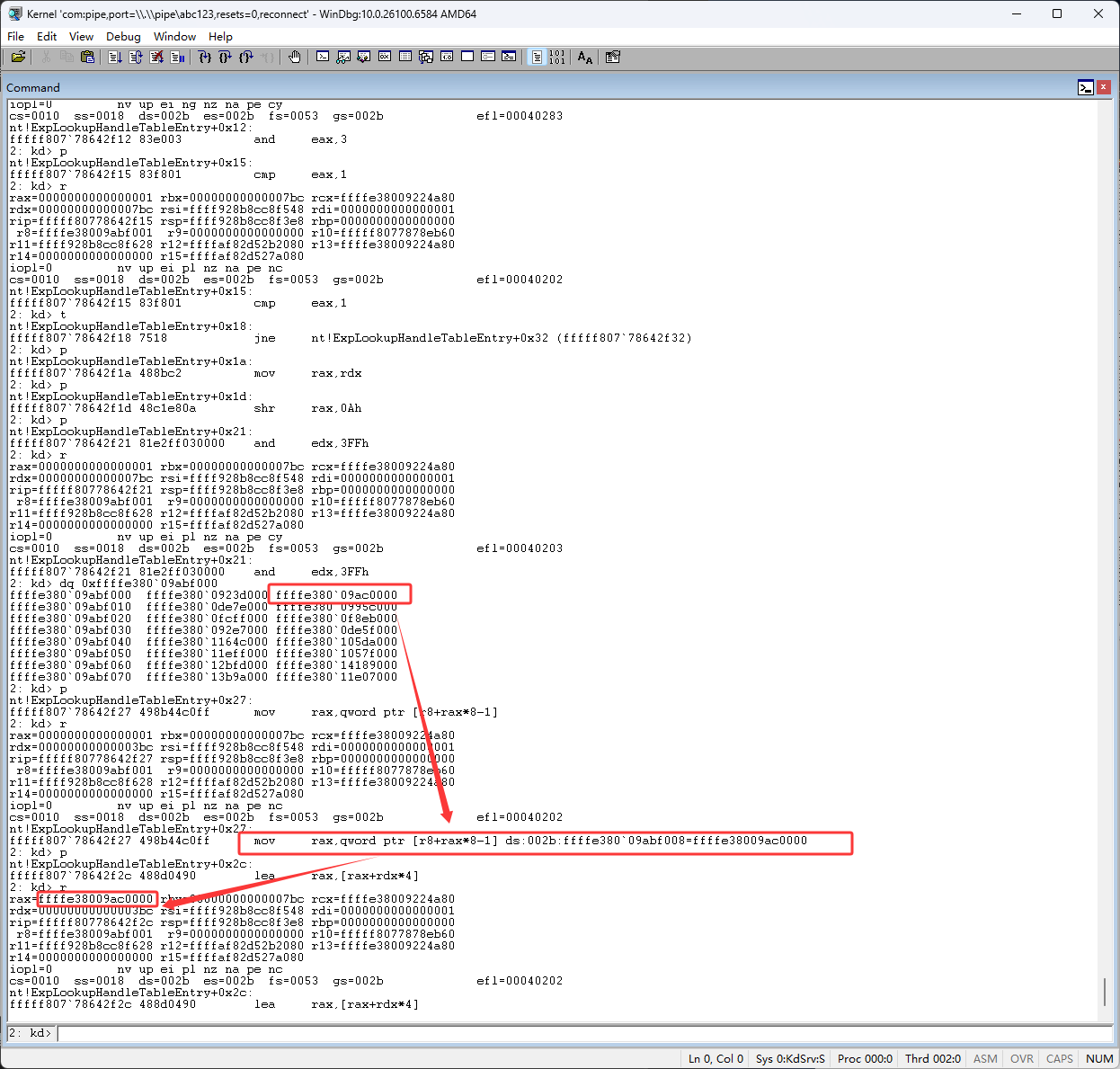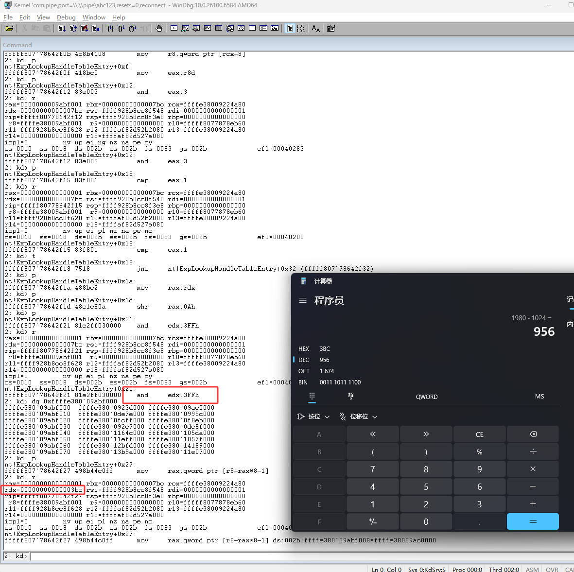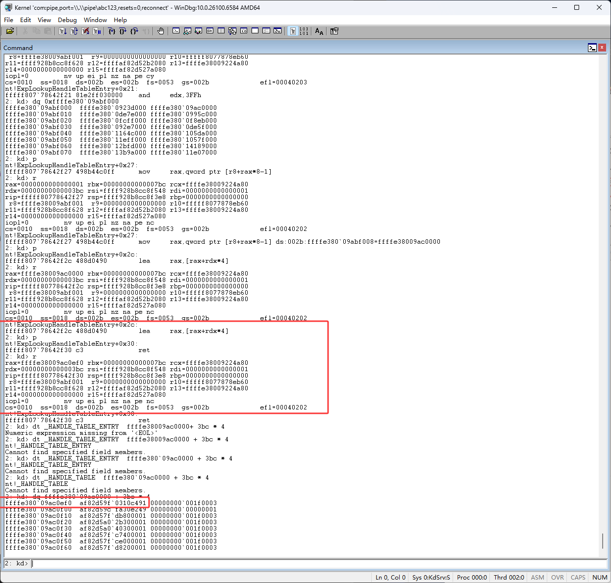 下图红框的 shr rax,0Ah 代码是右移,句柄右移10位后就得到了(也就是pid除以1024),句柄表的所以,也就是下图红框的ffffe380`09ac0000