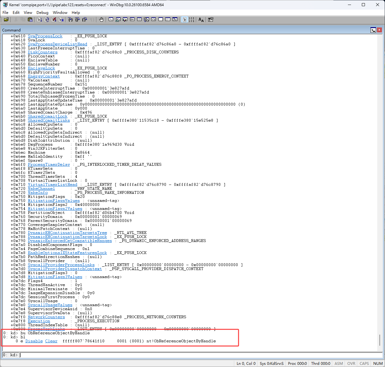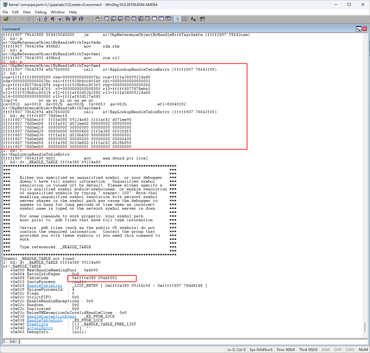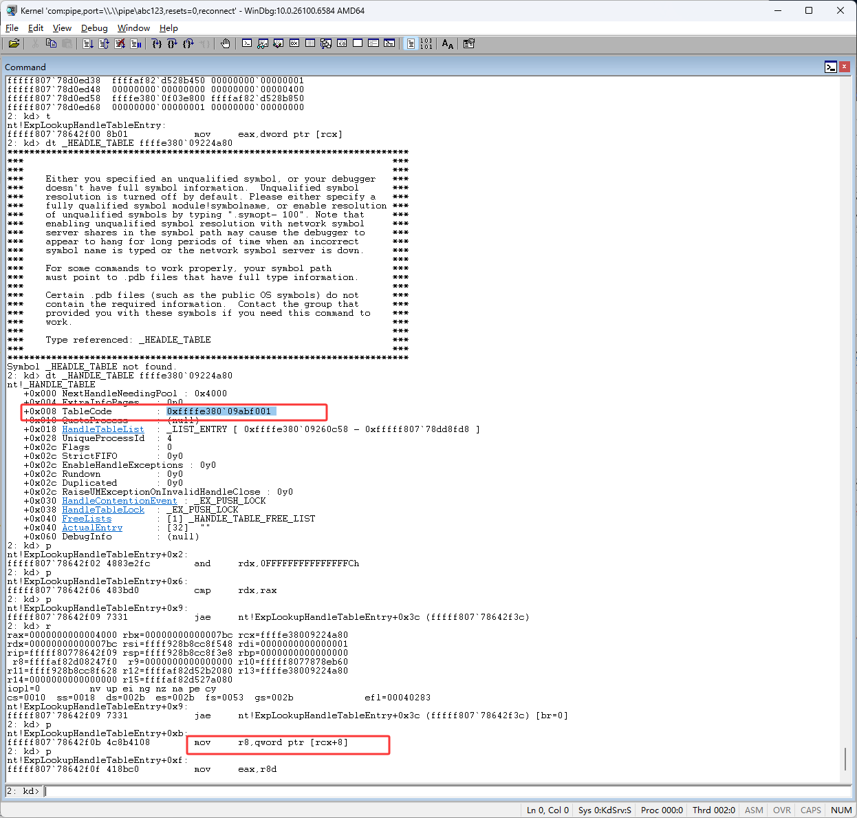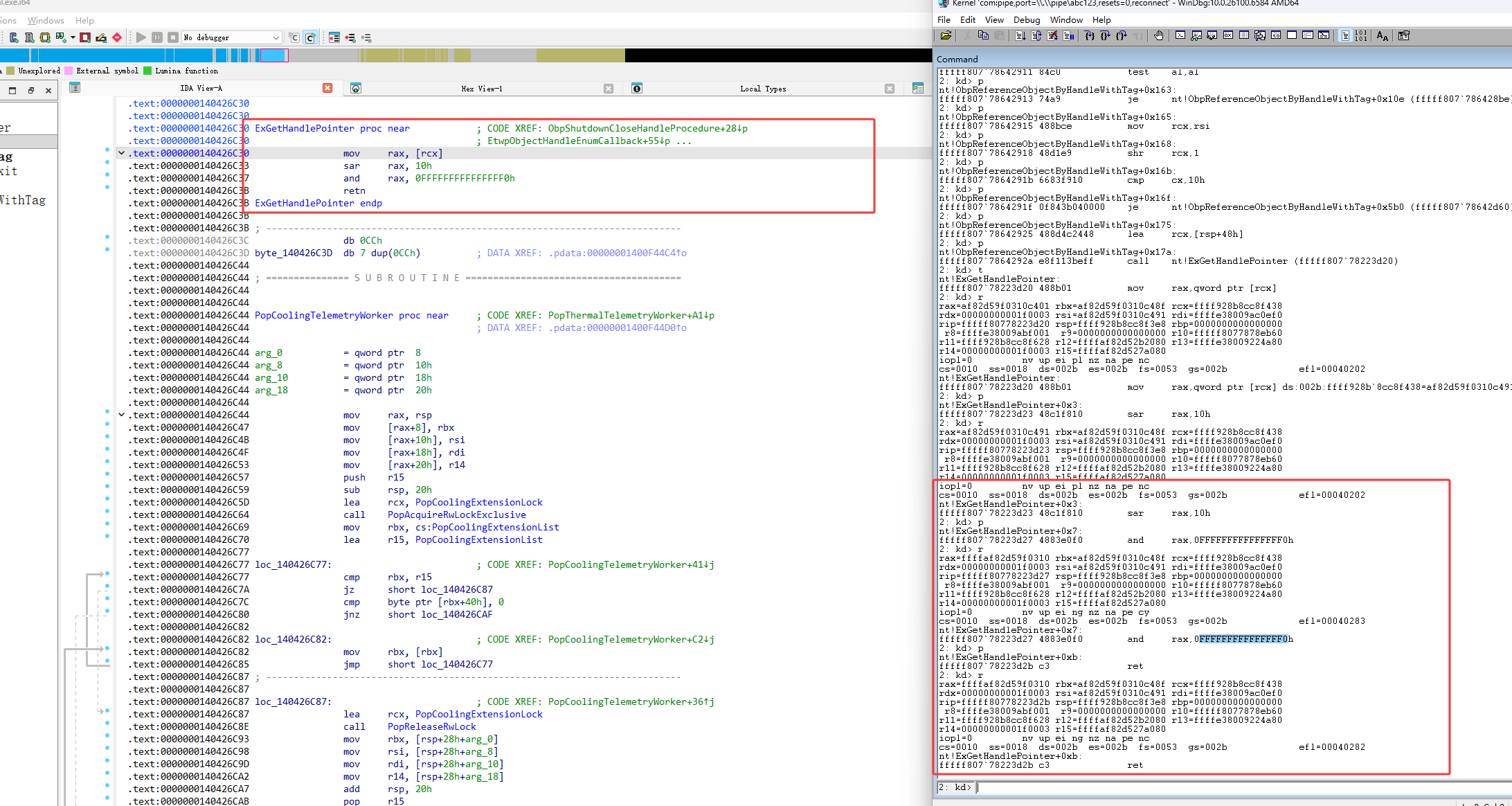 下图红框的 shr rax,0Ah 代码是右移,句柄右移10位后就得到了(也就是pid除以1024),句柄表的所以,也就是下图红框的ffffe380`09ac0000