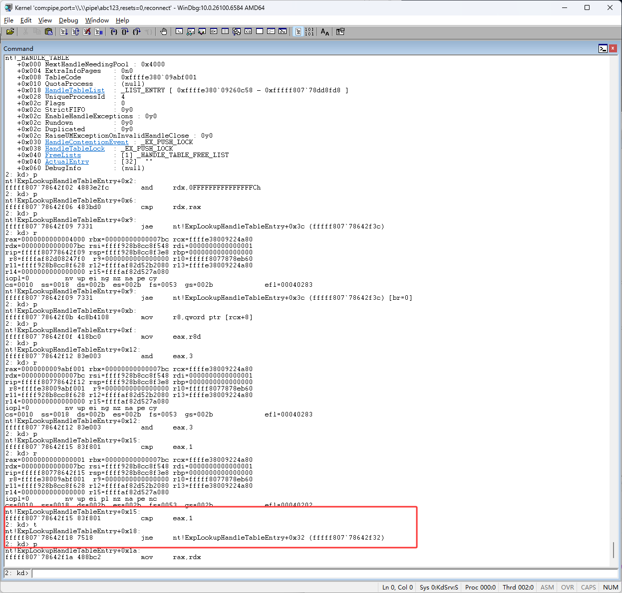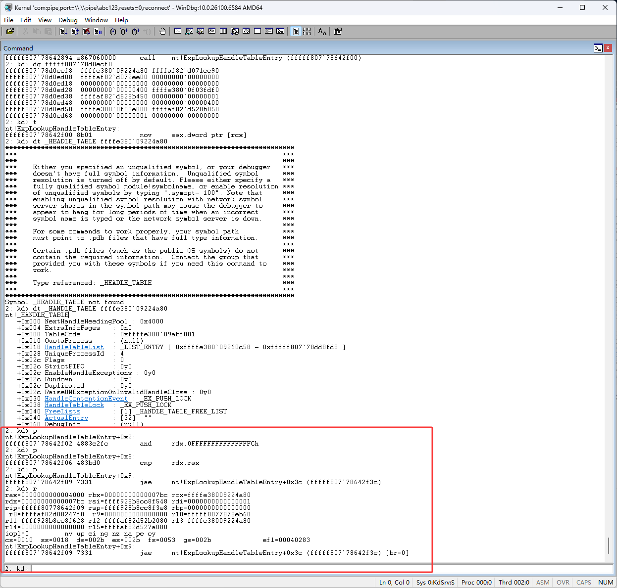 rcx来自于gs段寄存器,如果有机会会详细写段寄存器,接下来使用Windbg一步一步调试,看看全局句柄表的算法