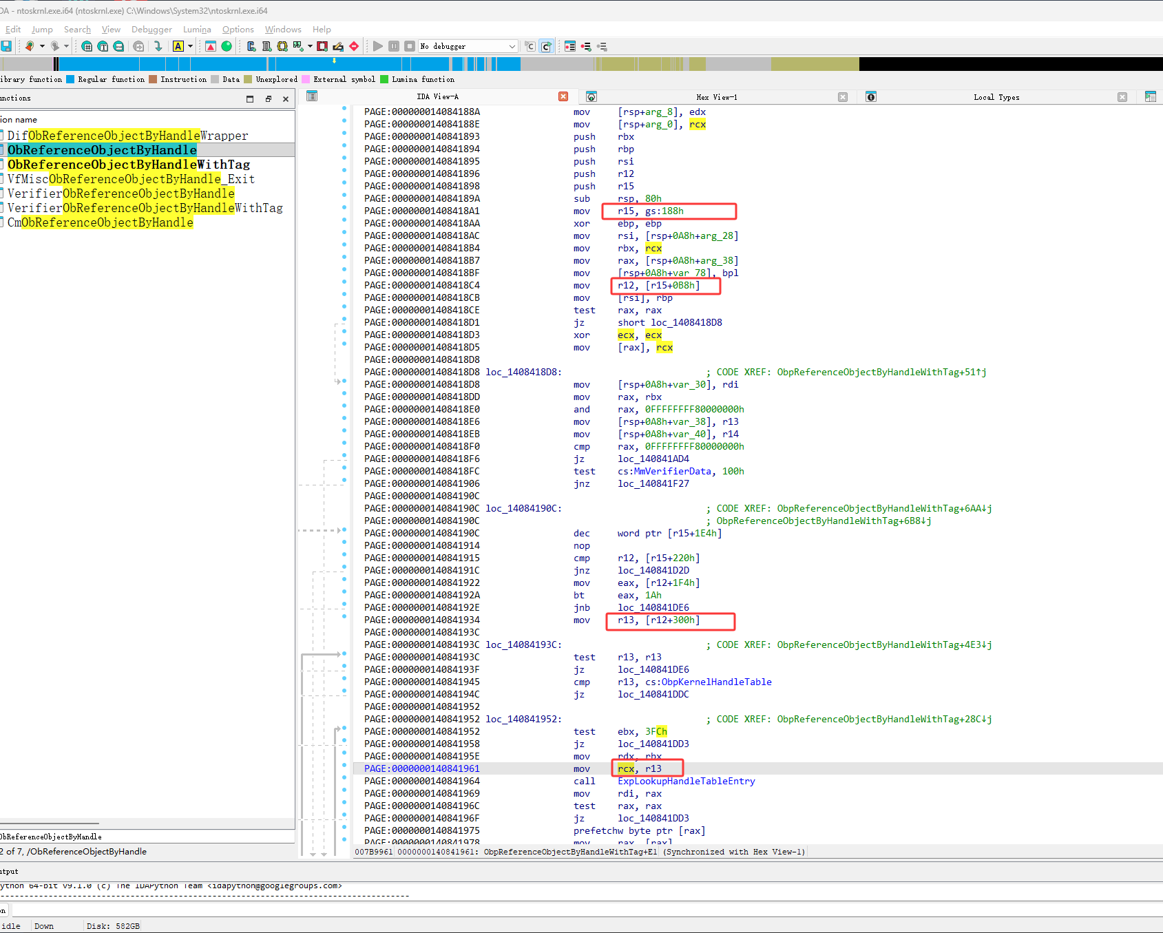 如下图红框,通过断点看出rcx的值来自于ObpKernelHandleTable,这是内核句柄表