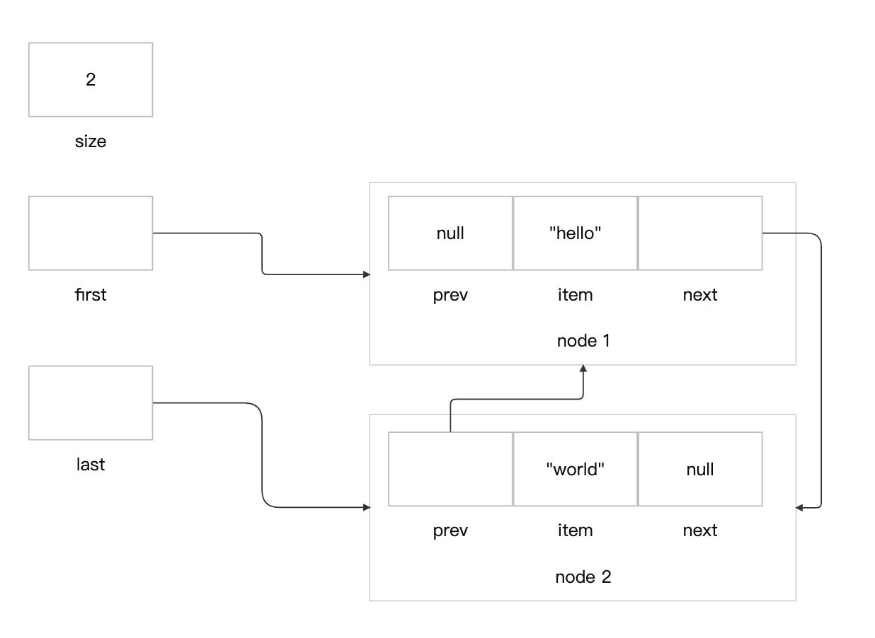 此时,LinkedList对象的实例属性size为2,first指向第一个元素所在节点node1,last指向第二个元素所在节点node2。