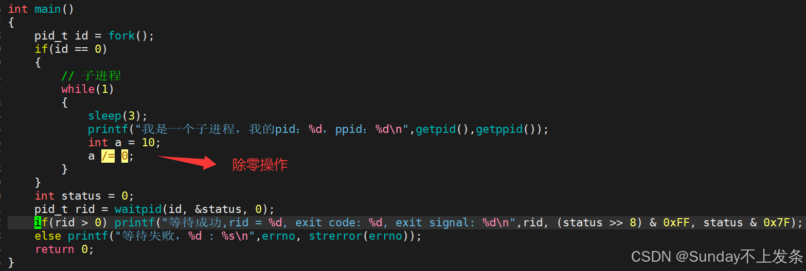 子进程异常终止,父进程等待成功,status 的低 7个比特位的值为8,对应8号信号(算术运算错误:除零错误)。
