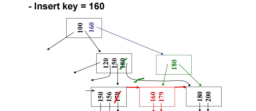 - 分裂 : 创建一个新叶结点。将原结点的 n+1 个键(含新键)平分(约