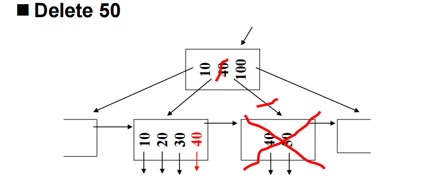 - 父结点的分隔元被删除,可能导致父结点也下溢。