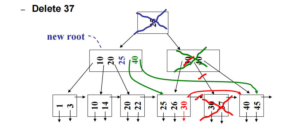 - 如果合并操作递归传递到根,导致根只剩一个指针,则该根被删除,其唯一的子结点成为新根。树的高度 -1。