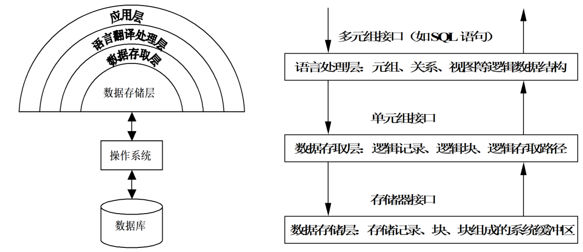 - 多元组接口 (如SQL): 应用层与语言翻译处理层之间。