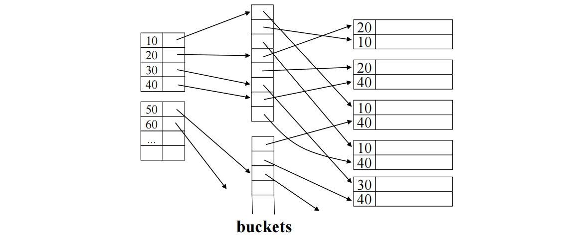 - 倒排列表 : 这种"桶"的思想在信息检索(IR)中称为倒排列表,用于索引"包含某个词(cat, dog)的所有文档"。