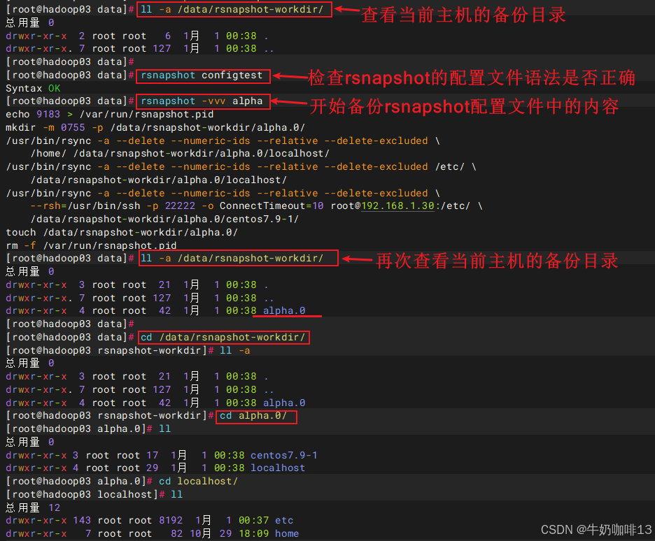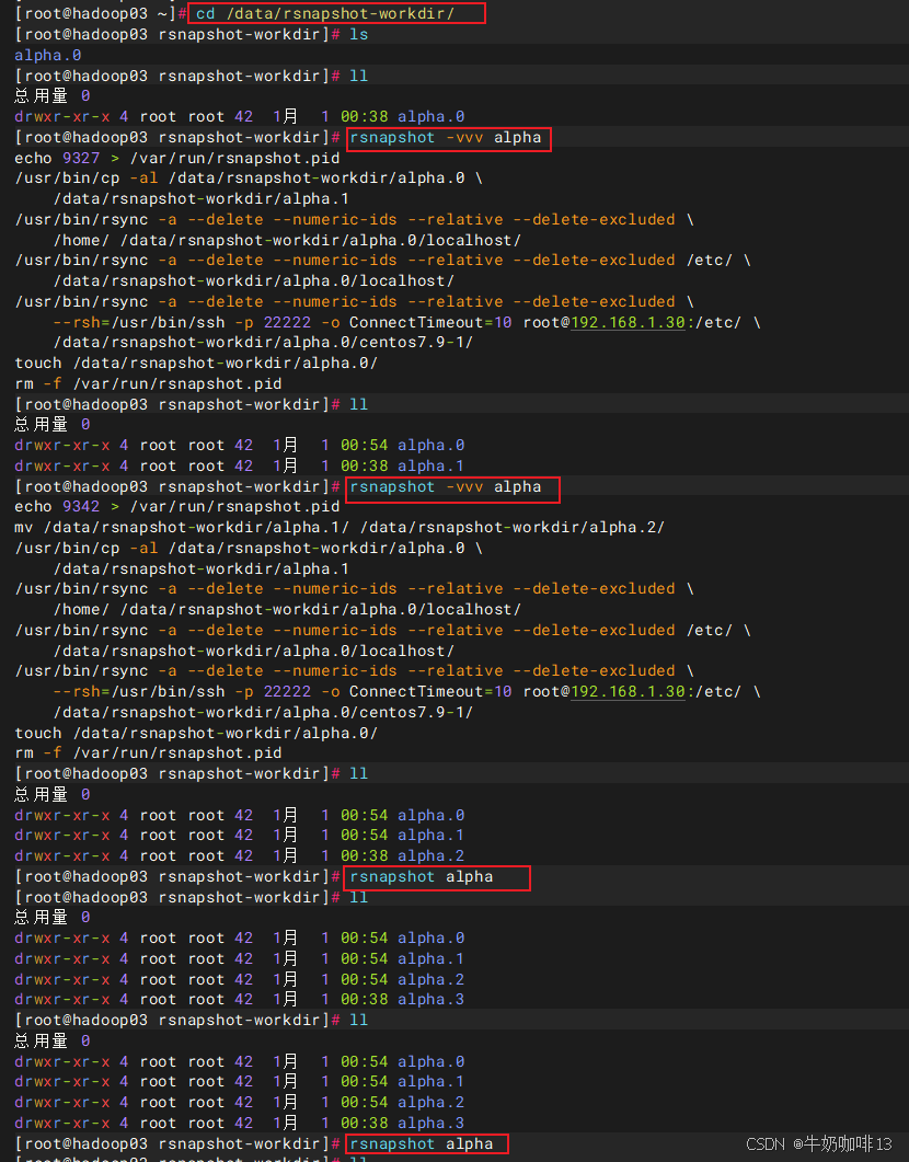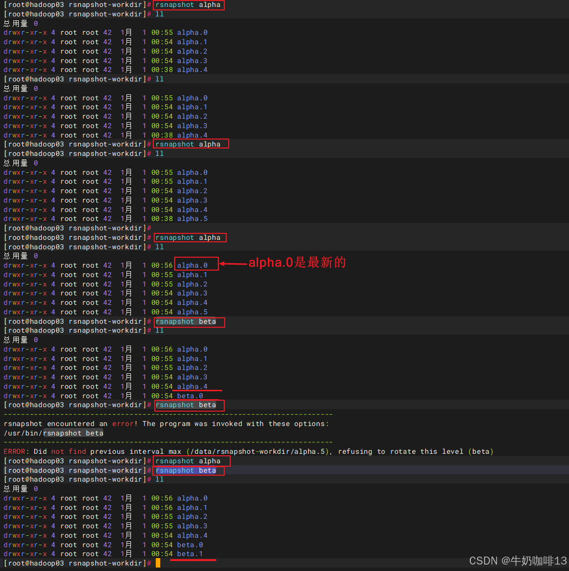 #4-后续若要再次备份则继续执行备份命令即可(会自动在【rsnapshot的配置文件指定的备份目录】下自动生成最多6个alpha【即:alpha.0至alpha.5】)