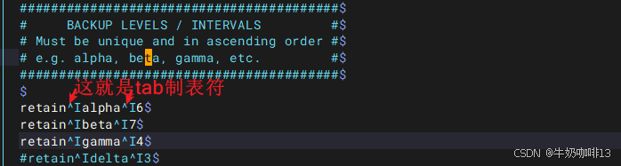 注意:关于rsnapshot的配置文件,不同时间间隔的备份数量配置名称与间隔可以自定义如下所示(要查看间隔是否为tab制表符可以使用【vim /etc/rsnapshot.conf】打开然后输入【:set list】即可查看完整内容【^I】表示tabl制表符):