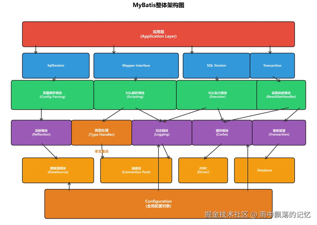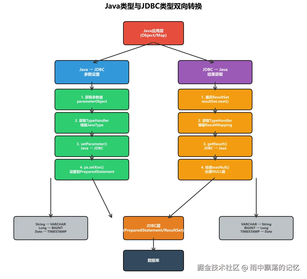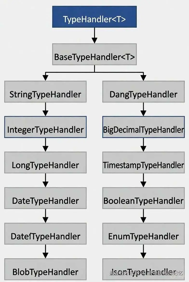 从架构图可以看出,MyBatis采用了分层架构设计,而类型处理模块(TypeHandler)位于基础支撑层,是连接Java类型与JDBC类型的桥梁。它负责在SQL执行过程中,将Java对象参数转换为JDBC能够识别的参数类型,以及将ResultSet中的数据转换为Java对象。