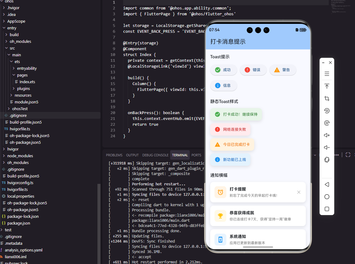 消息提示是移动应用中向用户传递反馈信息的重要组件。在打卡工具类应用中,消息提示用于显示打卡成功、操作确认、错误警告等各种反馈。本文将详细介绍如何在Flutter和OpenHarmony平台上实现美观且功能完善的消息提示组件。
