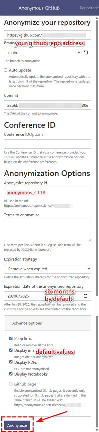 Step 4: 输入需要匿名化的Github仓库地址,输入后页面会自动跳转。