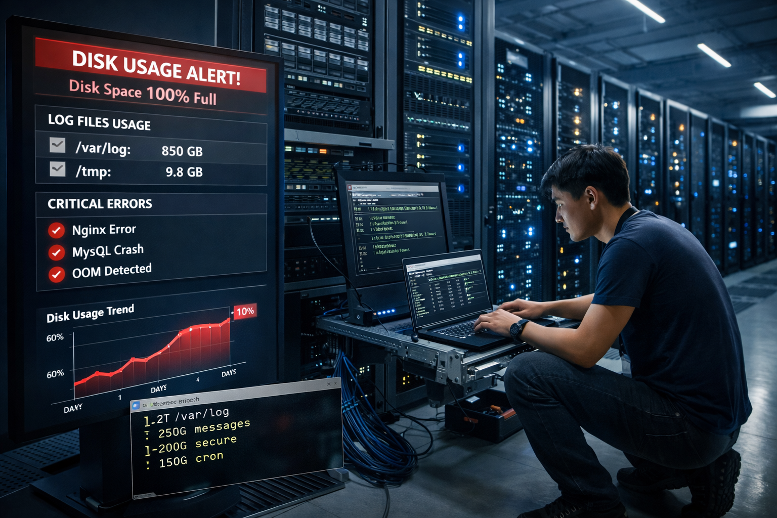 我长期负责跨境电商与游戏服务器集群运维,在多个生产环境中反复遇到过因为 磁盘空间耗尽 而导致服务崩溃的事故。特别是在一些使用了 CentOS 7.6 的老旧服务器上,日志文件、临时文件不断积累,一旦磁盘被写满,数据库崩溃、Web 进程卡死、监控告警频繁触发,整个业务链都会受到影响。