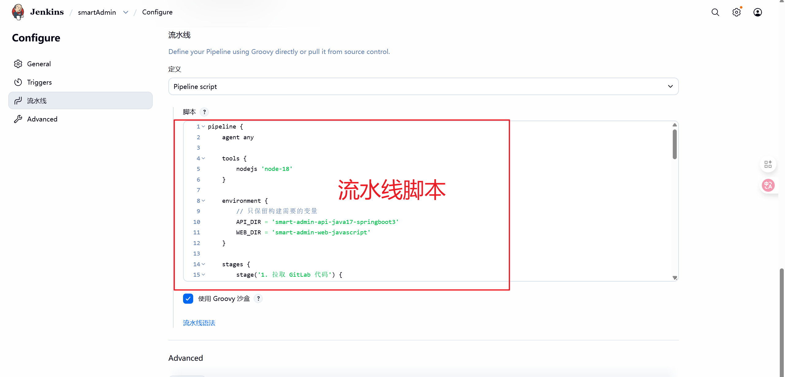 在Jenkins的项目配置里面,如果创建的是流水线项目。