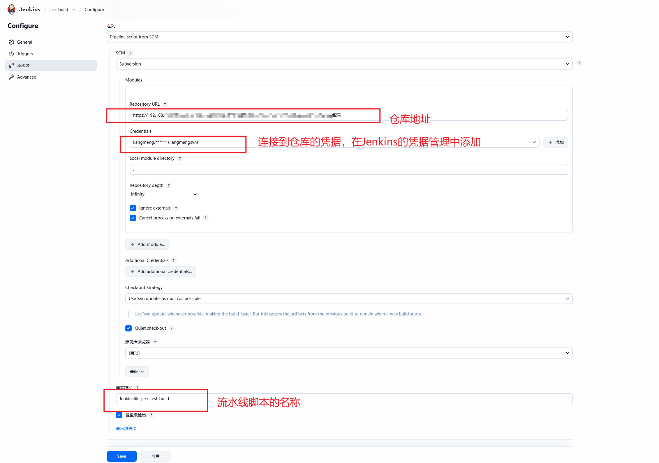 方式二,要先在代码仓库(svn、gitlab等)创建一个文件,在文件中编写流水线配置脚本,配置页面填写文件的路径,Jenkins在构建时,会从仓库中把文件拉出来读取。