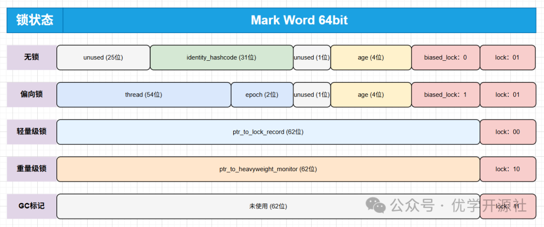 Mark Word的结构并非固定不变,而是会根据对象的"锁状态"动态变化------JDK1.6为synchronized引入锁优化后,锁状态分为4种:无锁状态、偏向锁状态、轻量级锁状态、重量级锁状态。不同状态下,Mark Word存储的信息不同,目的是在不同并发场景下平衡性能与安全性。