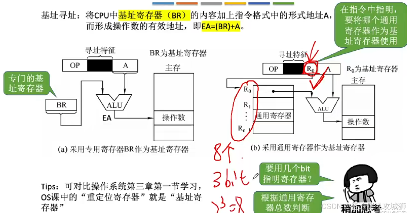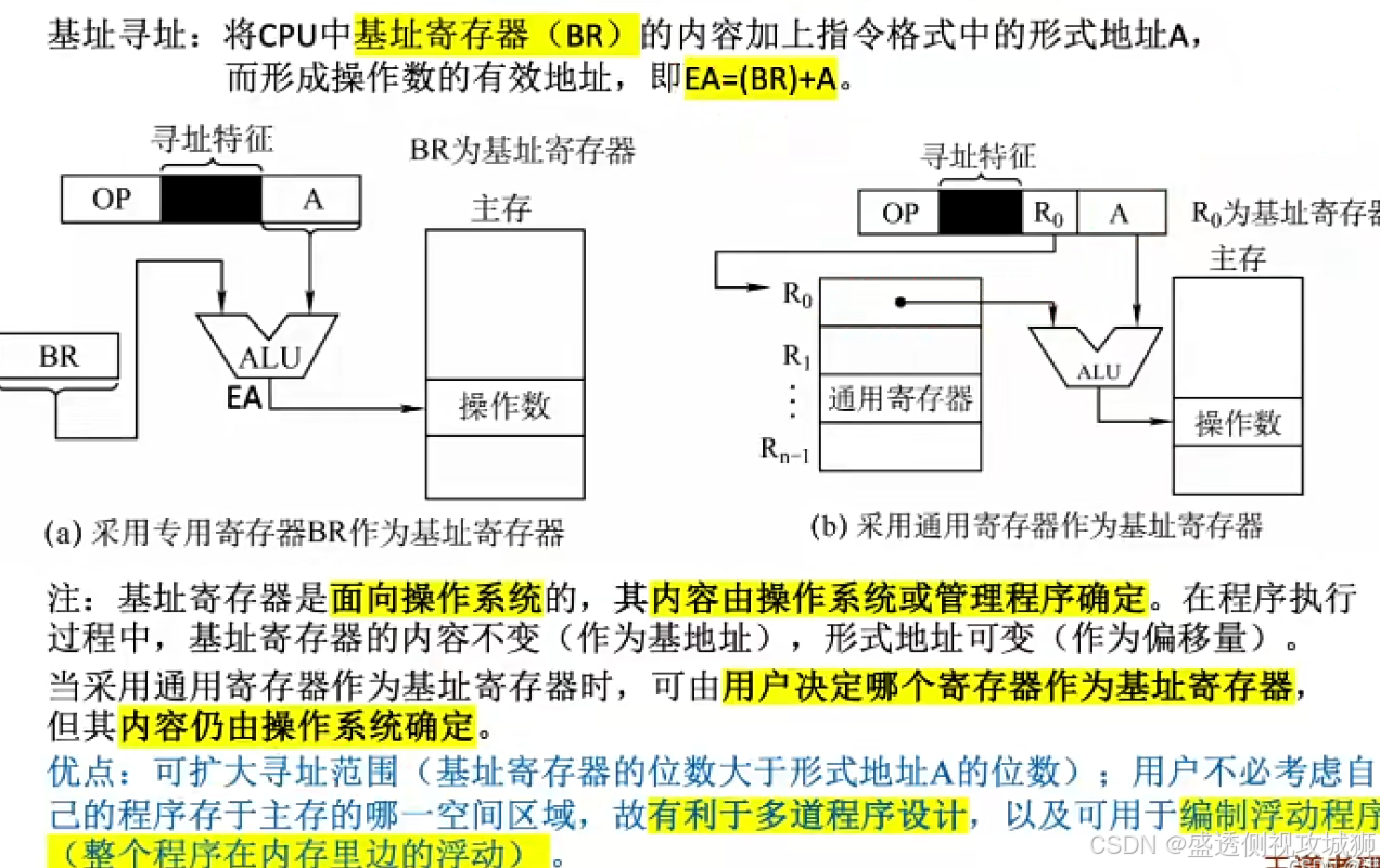 - 两种方式有效地址的形成都是寄存器内容+偏移地址,但是在基址寻址中,程序员操作的是偏移地址,基址寄存器的内容由操作系统控制,在执行过程中是动态调整的;