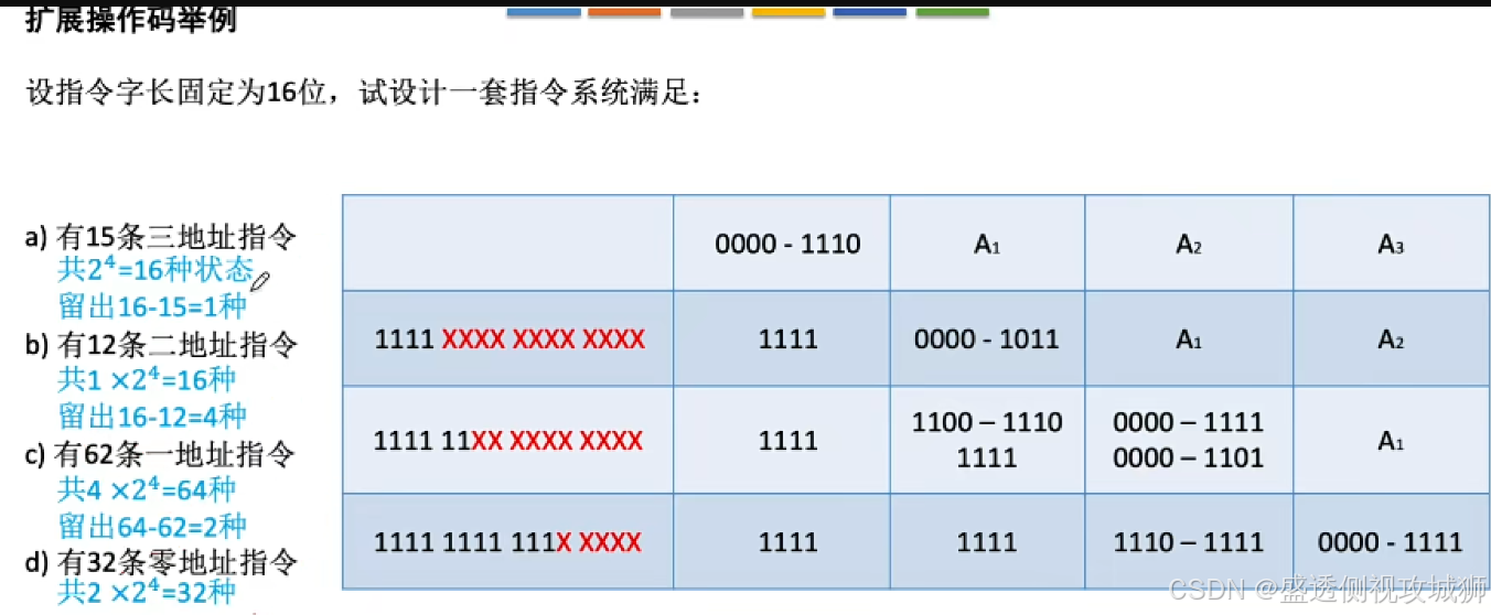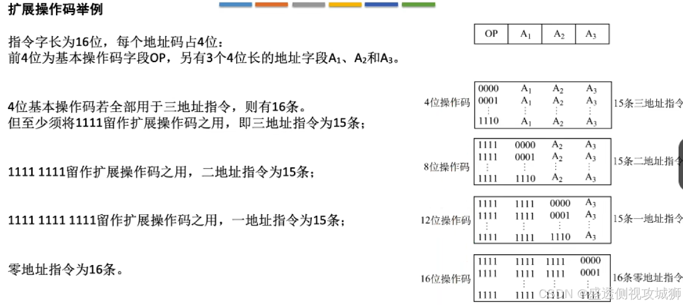 - 定长指令字结构+可变长操作码-->扩展操作码指令格式(不同地址数的指令使用不同长度的操作码)