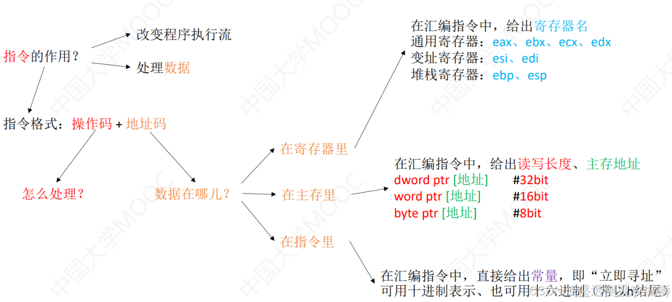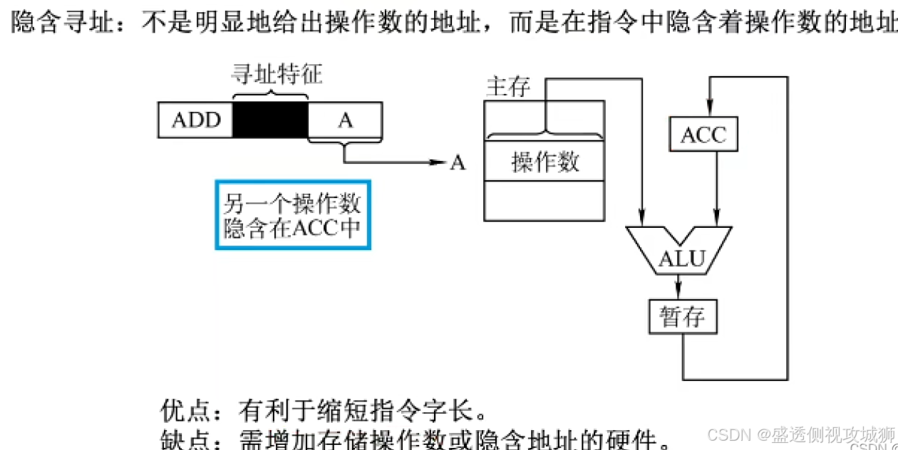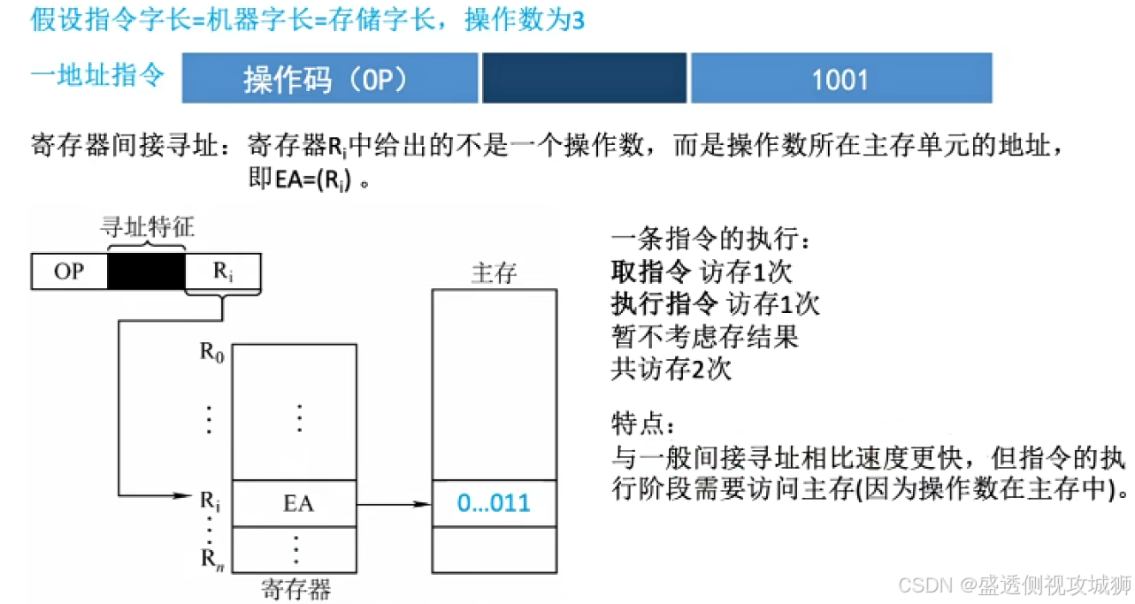 - 而运算指令不能直接访问内存,只能从寄存器取数进行运算,运算的结果也只能送到寄存器。因为寄存器编号较短,而主存地址位数较长,通过某种方式可使运算指令和访存指令的长度一致。