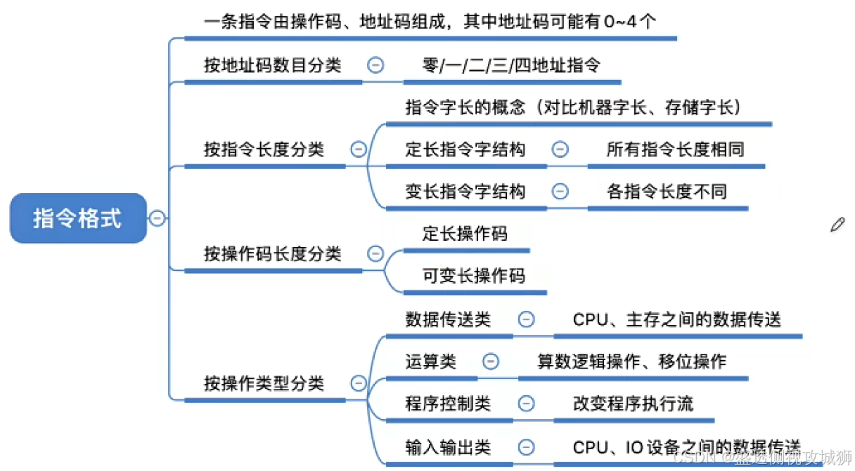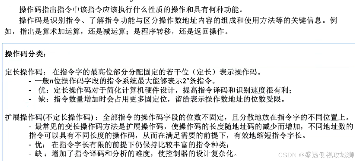 - 其中,操作码指出指令中该指令应该执行什么性质的操作和具有何种功能,它是识别指令、了解指令功能与区分操作数地址内容的组成和使用方法等的关键信息。