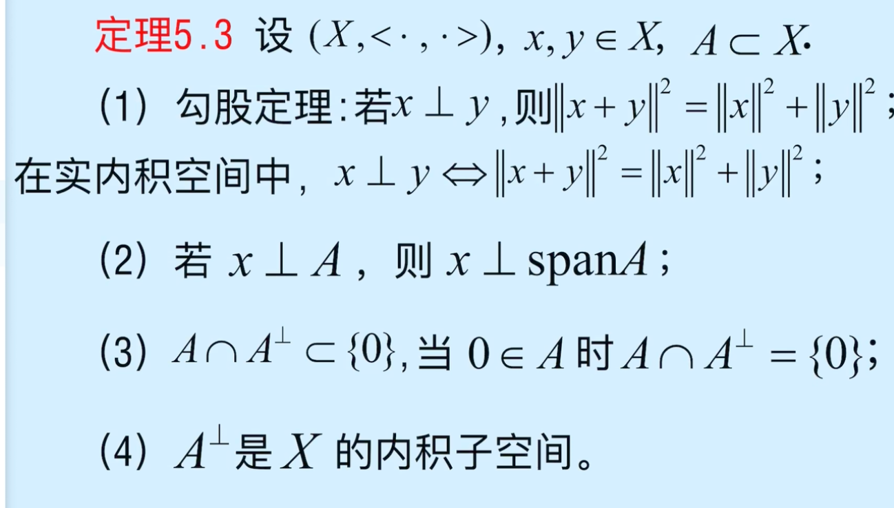 - 若 ∀ a ∈ A \forall a \in A ∀a∈A,有 x ⊥ a x \perp a x⊥a,则称元素 x x x 与集合 A A A 正交,记为 x ⊥ A x \perp A x⊥A