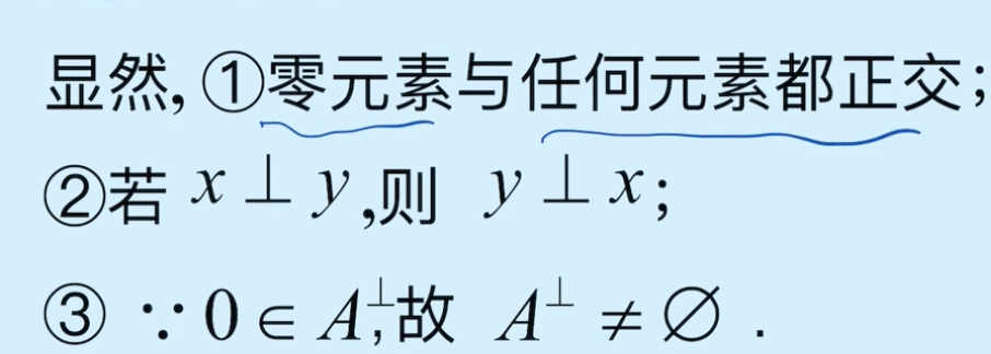 - 将X中所有与集合 A A A 正交的元素构成的集合记为 A ⊥ A^{\perp} A⊥,并称其为集合 A A A 的正交补。