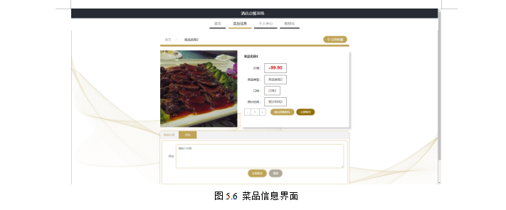 图5.6 即为编码实现的菜品信息界面,会员通过查看菜品介绍来了解菜品,会员可以在菜品信息界面的下方评论区域发布对菜品的评论,会员点击购买按钮即可实现对菜品的下单购买。