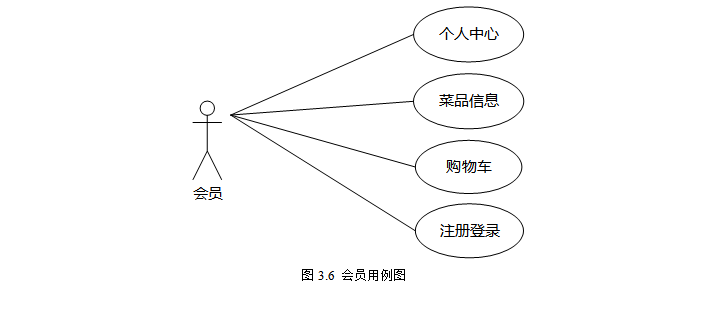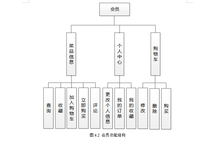 图4.2即为设计的会员功能结构,会员权限操作的功能包括收藏喜欢的菜品,发布关于菜品的评论,购买菜品,查看菜品购买信息等。