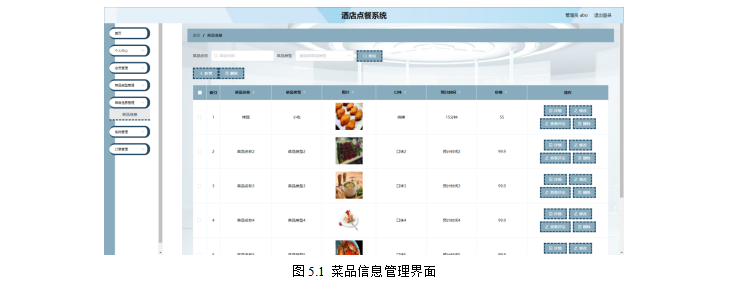 图5.1 即为编码实现的菜品信息管理界面,菜品信息包括口味,预计时间,价格等信息,管理员新增菜品,更改登记错误的菜品信息,查看菜品的用户评论信息。