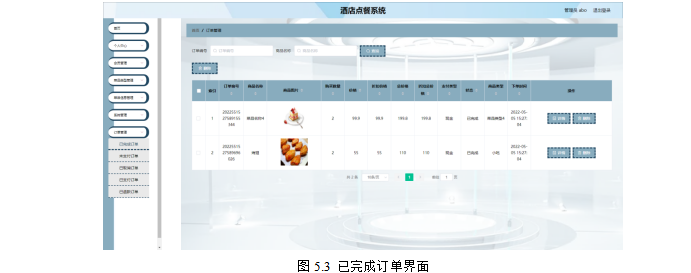 图5.3 即为编码实现的已完成订单界面,已完成订单信息包括支付类型,价格等信息,管理员除了可以查看已完成订单详情之外,也能删除需要删除的已完成订单。