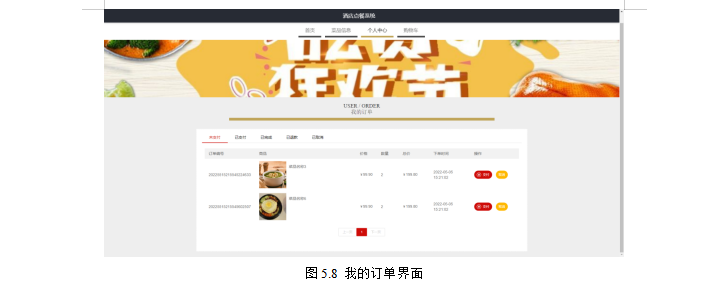 图5.8 即为编码实现的我的订单界面,会员如果并没有支付订单,则可以在未支付模块支付,会员也能查看其他状态的订单。