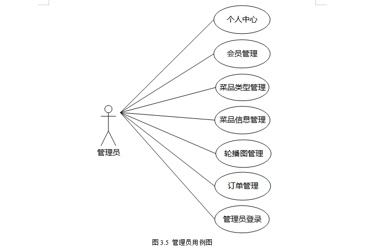 图4.1即为设计的管理员功能结构,管理员权限操作的功能包括对菜品信息,已完成,已支付,已取消,已退款等订单信息进行管理。