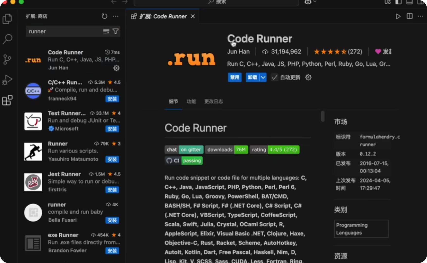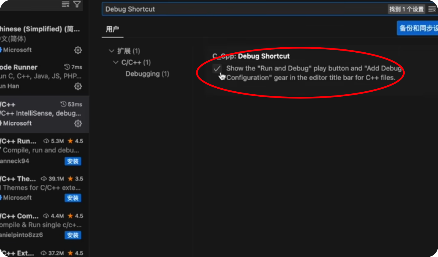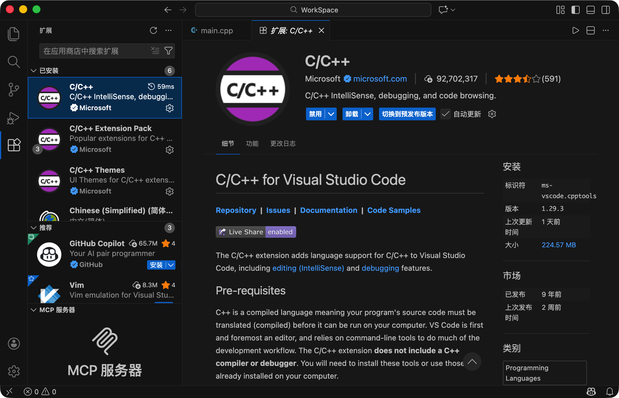 点击左边的一个四个方块类似的图标(插件)搜索C/C++,点击安装