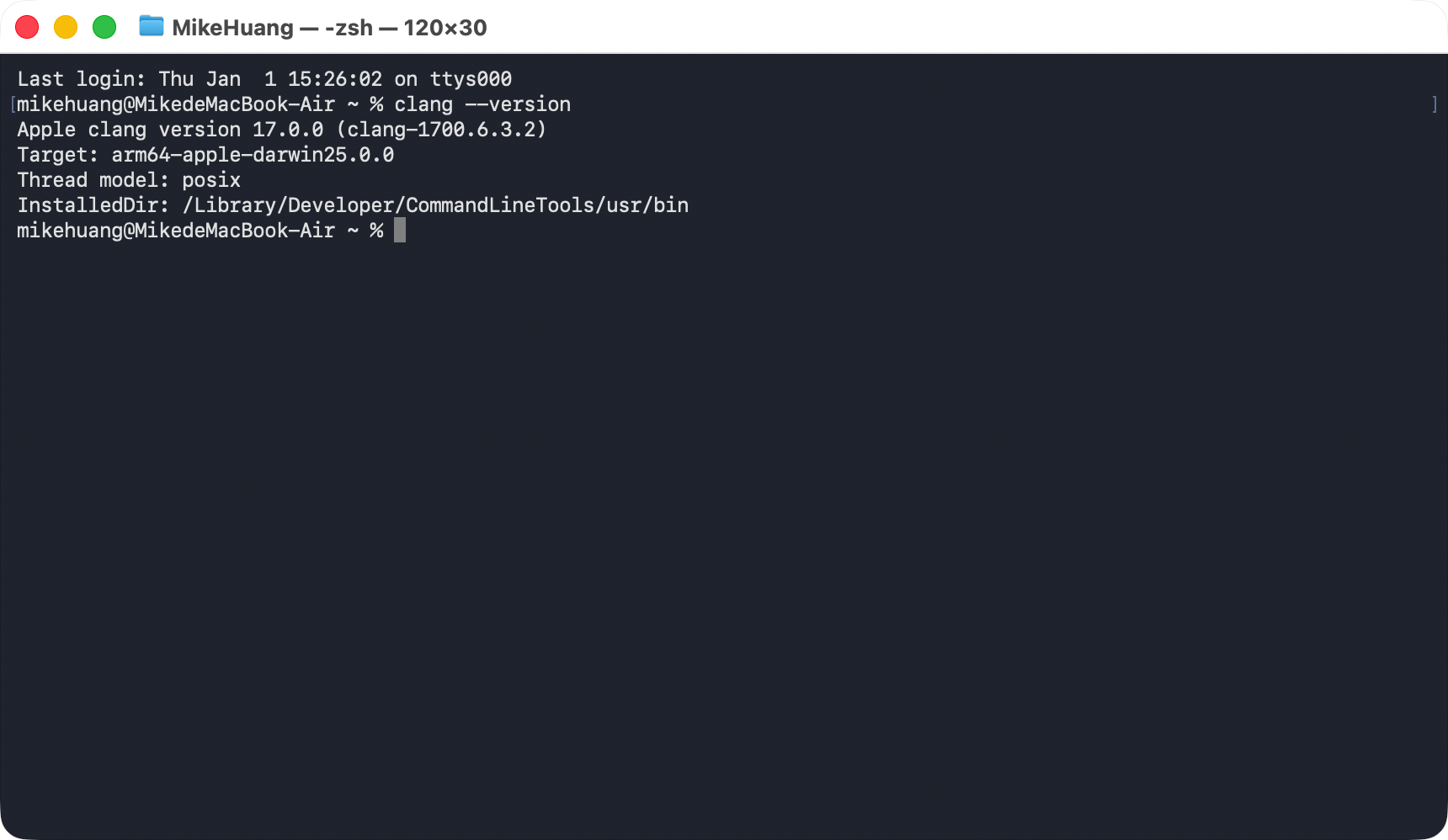 打开终端,输入,如果输出正常(这里指有输出版本号),就没事,如果没有输出版本号,你就要去安装clang(Command line tools) 这个是C/C++编译的东西,没有得汐。