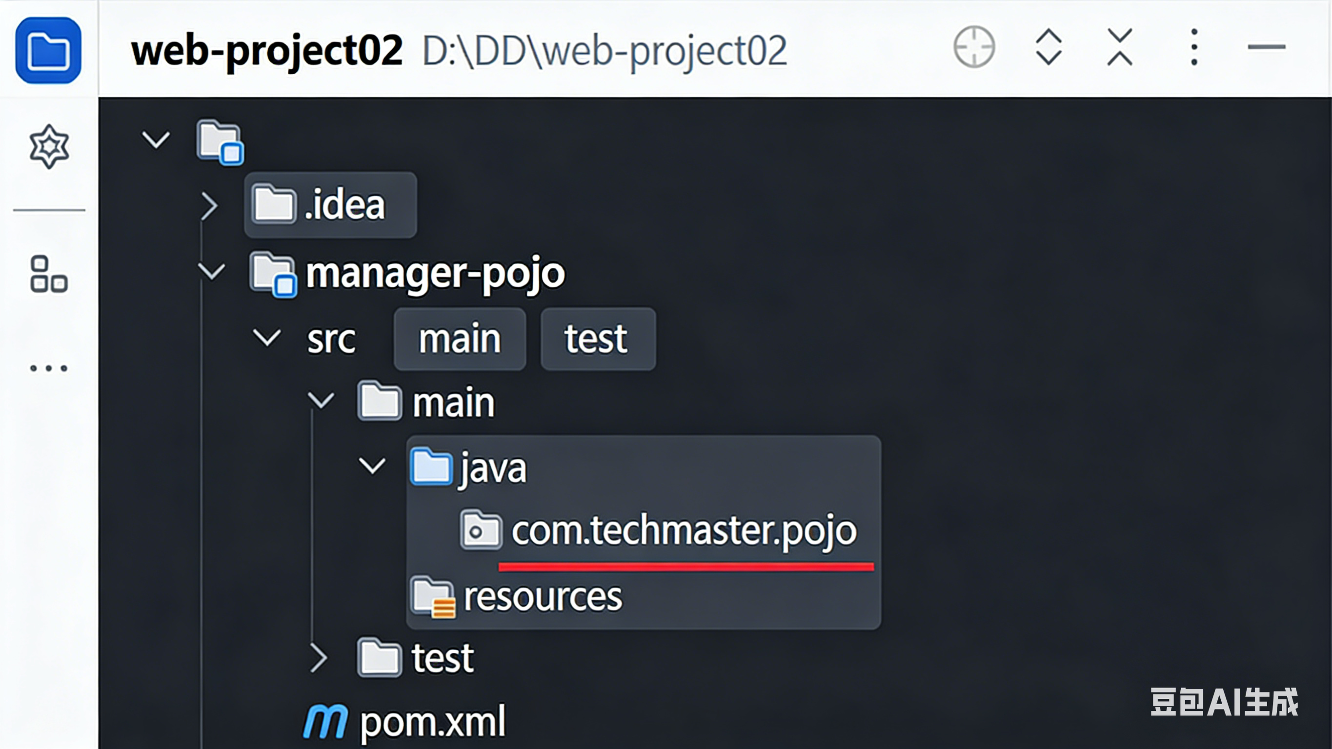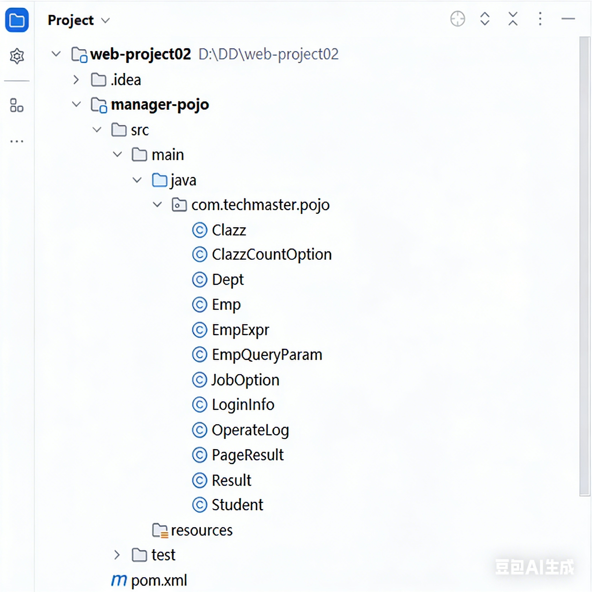 2.在模块中创建包:com.techmaster.pojo(与原项目包名一致,保证依赖后全类名不变)