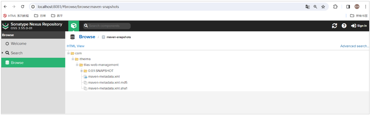 前提:企业私服已搭建完成(演示使用本地私服,地址:http://localhost:8081),可通过浏览器访问验证。