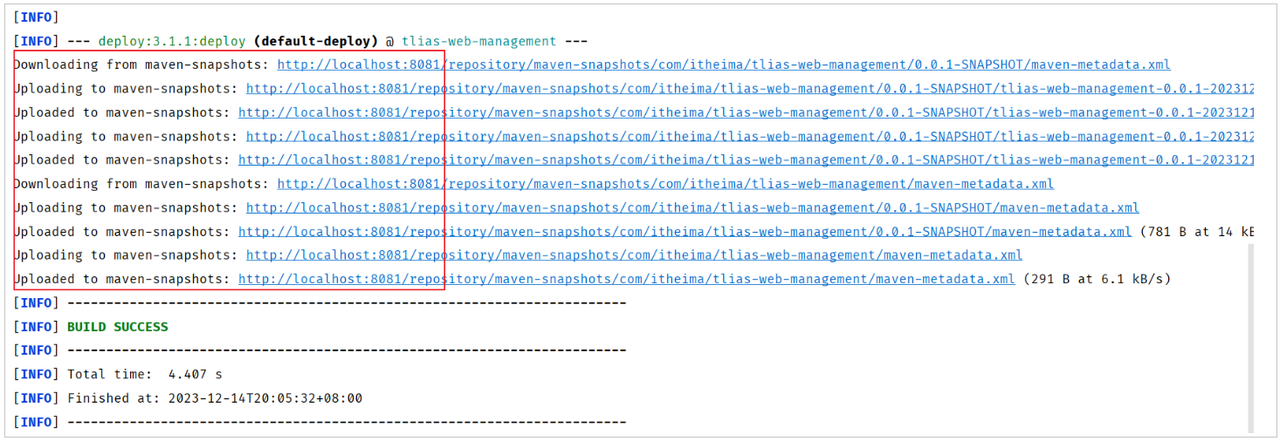 在聚合工程 manager-parent 上执行 deploy 命令,Maven 会自动将所有模块按版本上传到对应私服仓库: