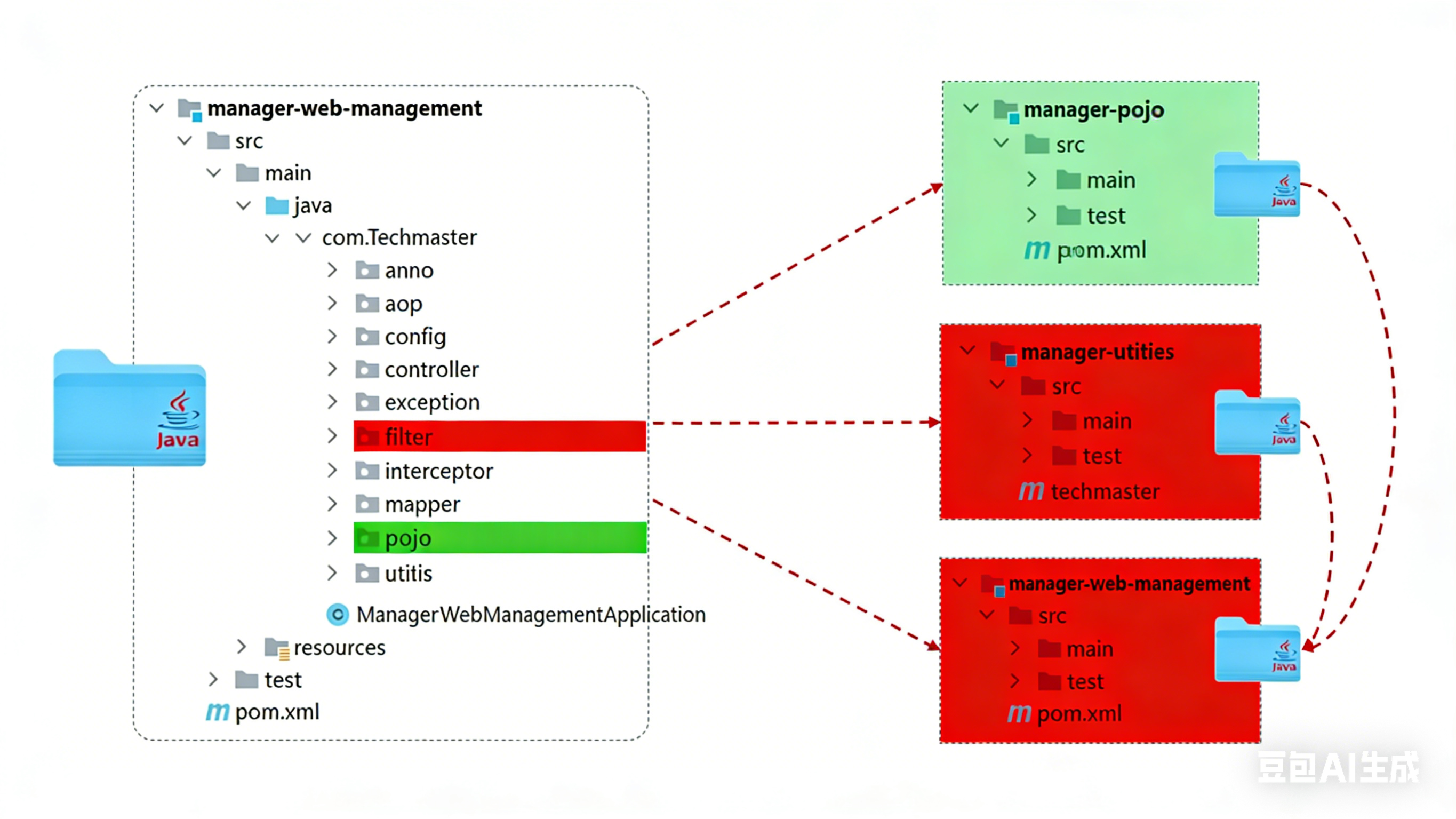 - 原有业务代码保留在 manager-web-management 模块,通过依赖引入manager-pojo 和 manager-utils