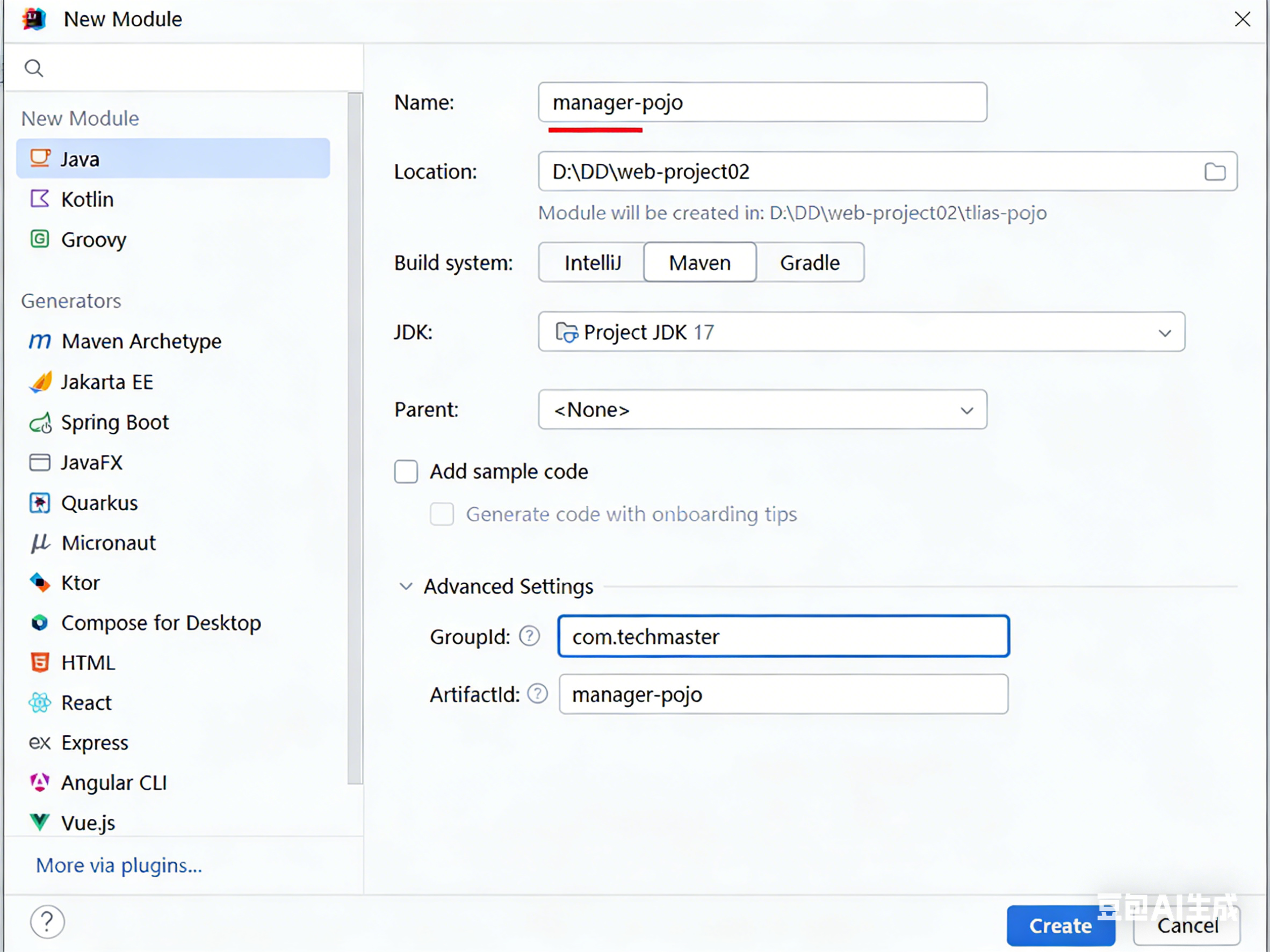 1.创建普通 Maven 模块,模块名:manager-pojo