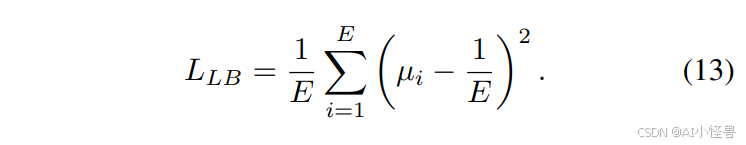 其中 Ω_train 表示在训练阶段计算的软Top-K权重。负载均衡损失 L_LB 采用均方误差形式来衡量 μ_i 与目标均匀利用率 1/E 之间的差异: