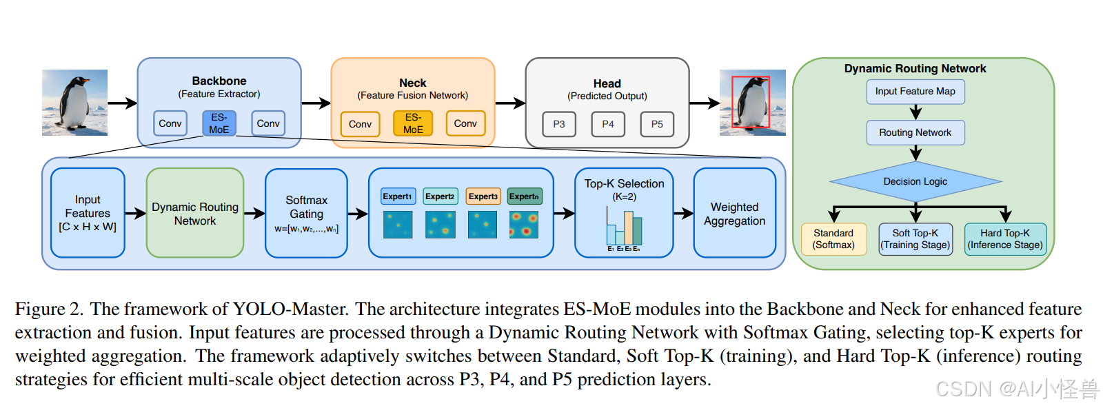 我们的YOLO-Master通过引入首个专为基于CNN的轻量级实时检测器量身定制的MoE框架来弥补这一不足。我们设计了一种在特征金字塔层级上运行的动态路由机制,能够基于空间特征进行自适应专家激活。训练-推理解耦的路由策略(训练时使用软性Top-K以保证梯度流,推理时使用硬性Top-K以实现真正的稀疏性)确保了优化稳定性和部署效率,使得条件计算在实时检测中得以实用。