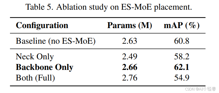 我们在表 5 中研究了 ES-MoE 模块的最佳放置策略。仅骨干网络集成 以 262 万参数取得了 62.1% mAP 的最佳性能,相比基线(60.8%)提升了 +1.3%。这验证了专家在早期特征提取阶段的专门化至关重要------骨干网络中的 ES-MoE 能够有效地学习尺度自适应和语义多样的表示,从而有利于下游检测。仅颈部网络集成 效果不佳,仅为 58.2% mAP(-2.6%),因为如果没有骨干网络提供的多样化输入特征,路由机制无法有效地实现专家专门化。普通的骨干网络产生同质化特征,限制了颈部网络发现互补专家模式的能力。令人惊讶的是,完全集成 (同时置于骨干和颈部网络)严重降低了性能至 54.9% mAP(相比基线 -5.9%)。我们将此归因于级联路由机制之间的梯度干扰:骨干和颈部的 ES-MoE 模块在反向传播过程中会产生冲突的路由梯度,破坏了训练稳定性并阻碍了专家专门化。这一发现揭示了一个重要的设计原则:更多的 ES-MoE 模块并不能保证更好的性能,精心的放置对于避免负面交互至关重要。基于这些结果,我们采用仅骨干网络集成 ES-MoE 作为默认配置,以平衡精度和训练稳定性。